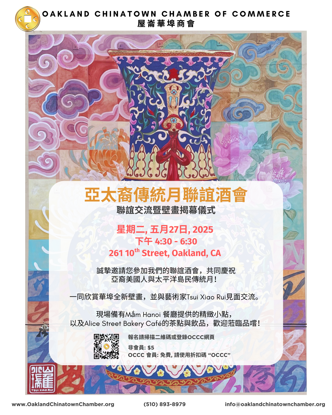 Join us for a networking mixer and celebration of Asian American and Pacific Islander Heritage Month! View Chinatown’s new mural and meet the artist Tsui Xiao Rui. Enjoy light appetizers from Mắm Hanoi Restaurant and refreshments from Alice Street Bakery Cafe!