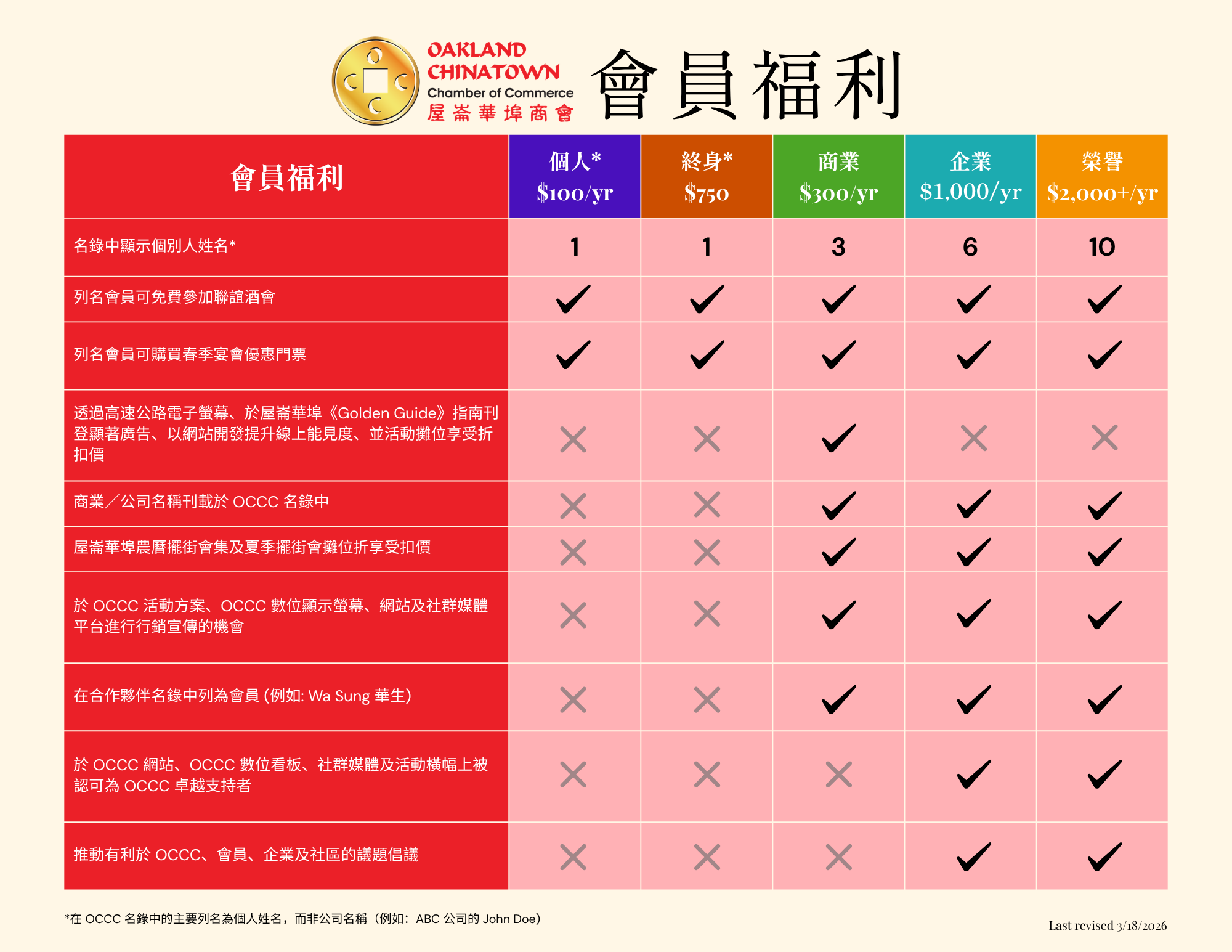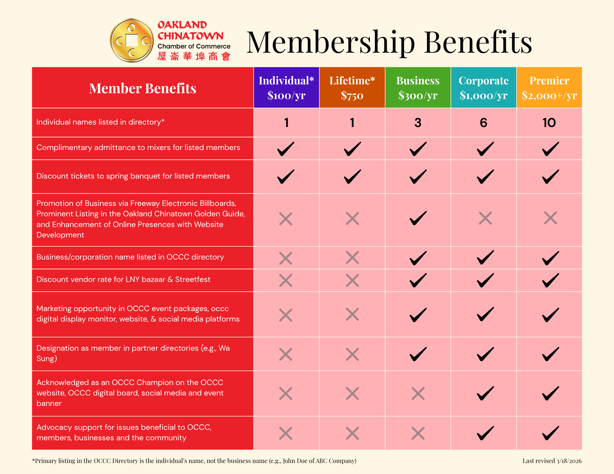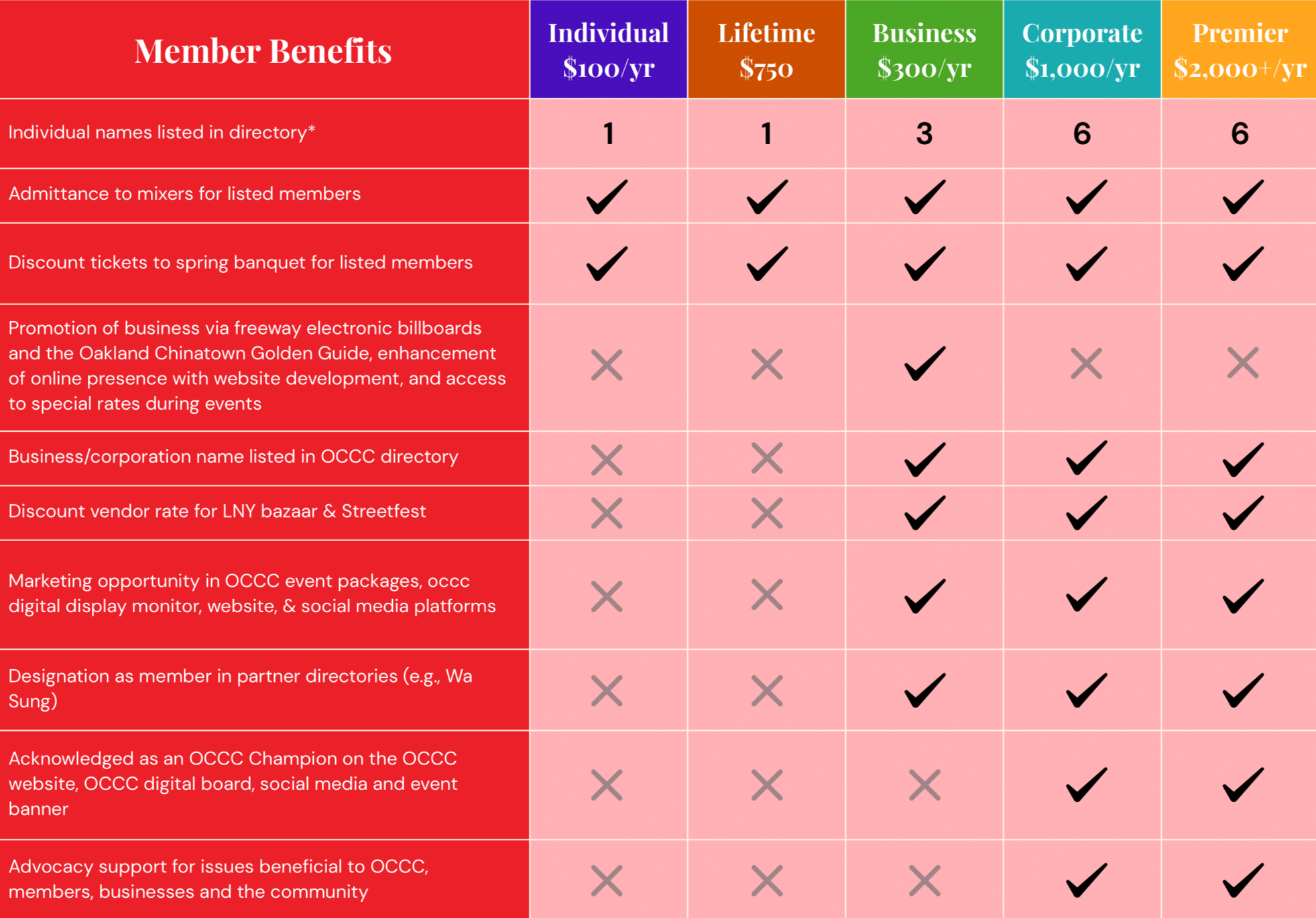 The Oakland Chinatown Chamber of Commerce (OCCC) was established in 1985 by a group of local professionals to promote business in the Asian community and provide a forum to discuss government policies.